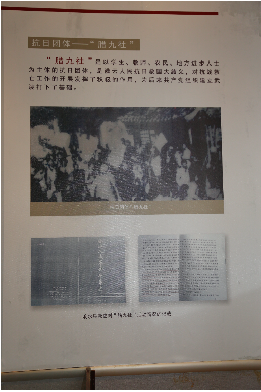 1937年9月,东海县抗日救亡义勇团成立。1938年1月,以教职员工、学生、农民和地方民主人士为主体的抗日团体“腊九社”在灌云县张湾成立,在城乡展开抗日宣传,唤醒了民众的民族意识。