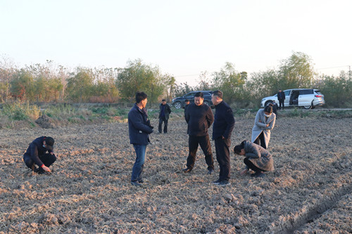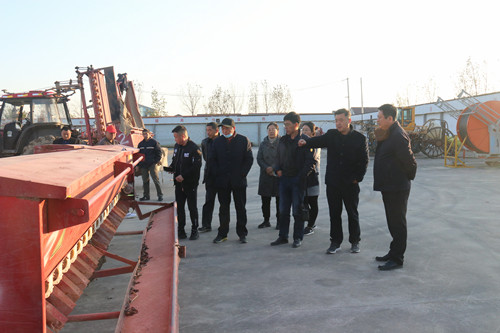白马湖分公司一行先后参观了云台分公司自行研发的宽幅精量轻简播种机、宽幅圆茼式镇压器和锥形镇压器,骆元详尽介绍了各式农机具的工作原理、性能效率,查看了四大队、五大队、八大队部分田块小麦播后出苗情况。