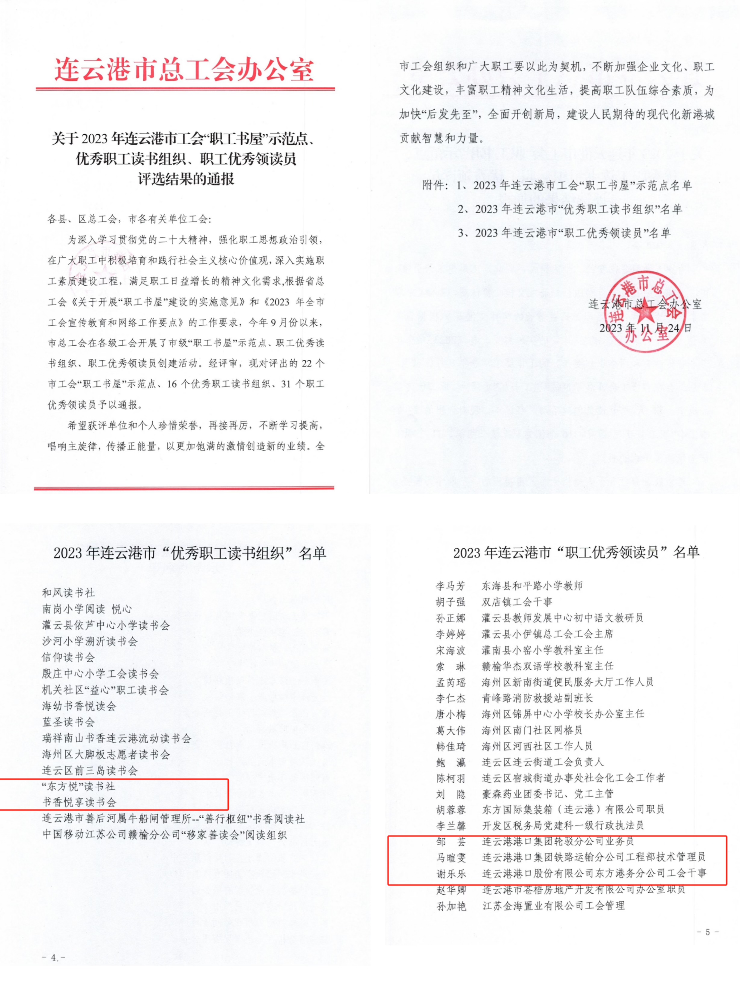 为深入学习贯彻党的二十大精神,强化职工思想政治引领,市总工会开展市级“职工书屋”示范点、职工优秀读书组织、职工优秀领读员评选活动。在此次评选活动中,东方公司“东方悦”读书社、铁运公司“书香悦享”读书会获评连云港市“优秀职工读书组织”,轮驳公司邹芸、铁运公司马暄雯、东方公司谢乐乐获评连云港市“职工优秀领读员”。