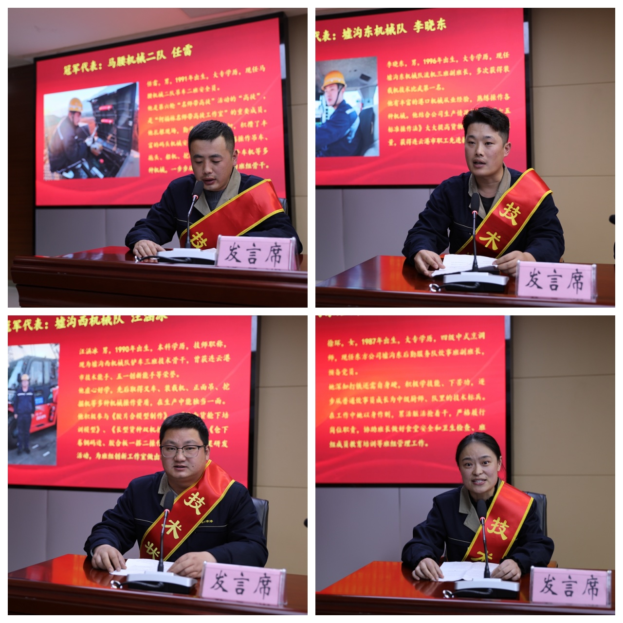 会上,大家共同观看了本届技术比武集锦视频《技能争霸展风采 匠心传承爱东方》,会议总结了技能争霸赛组织开展情况,宣读了《关于表彰“奋进东方”技能争霸赛先进集体和个人的通报》。随后,集团和公司领导分别为各项比赛前三名选手颁奖。吊车项目第一名马腰机械二队任雷、装载机项目第一名墟沟东机械队李晓东、叉车项目第一名墟沟西机械队汪涵冰、厨艺项目第一名墟沟东后勤服务队徐环4人以状元代表的身份上台发表获奖感言。