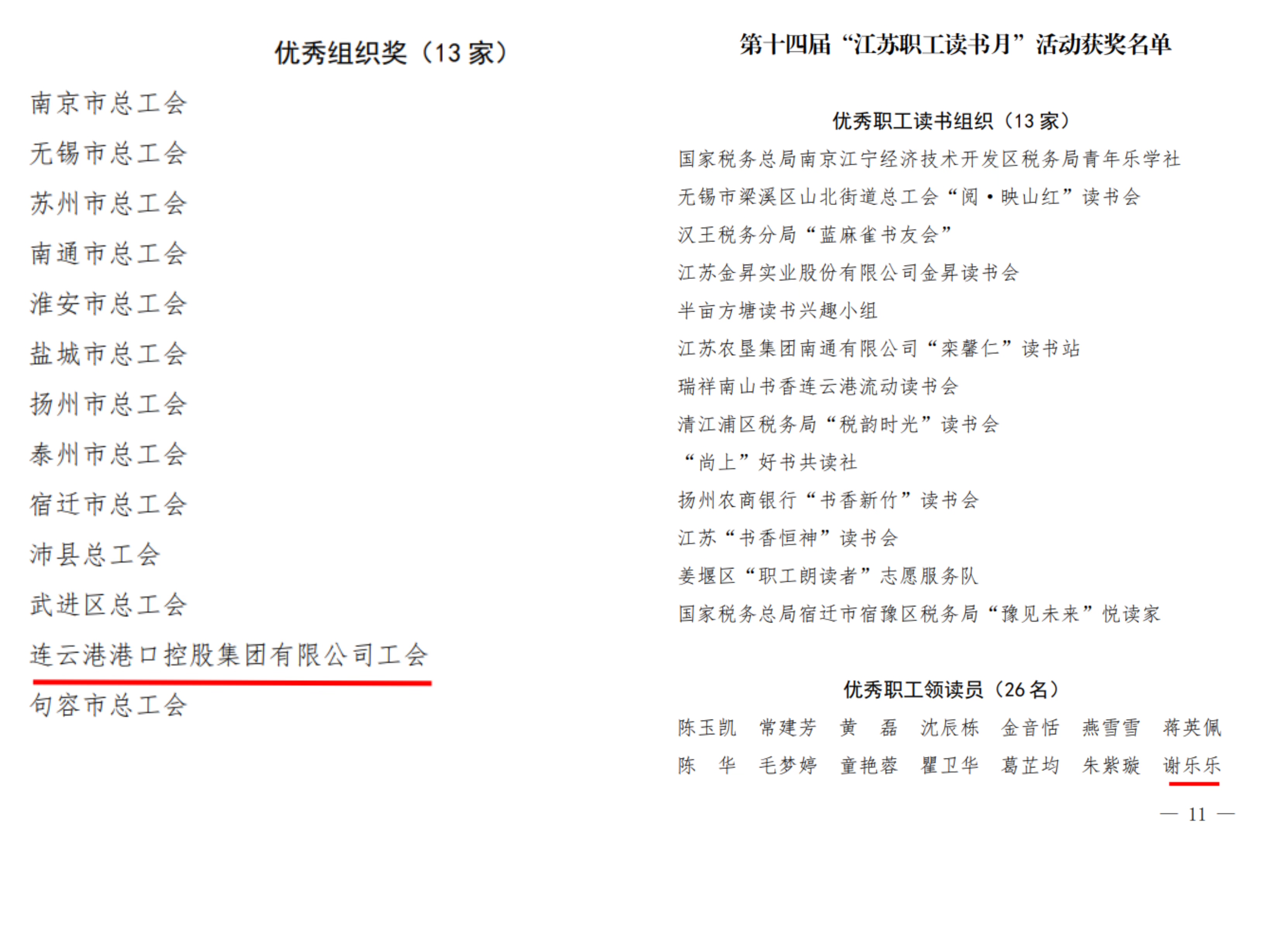 近日,从江苏省总工会传来好消息,在第十四届“江苏职工读书月”活动中,港口控股集团工会获评省级优秀组织奖,新海湾公司获评省级“职工书屋示范点”称号,东方公司职工谢乐乐获评省级“优秀职工领读员”称号。港口控股集团工会是全省唯一一家获评活动优秀组织奖的企业工会。