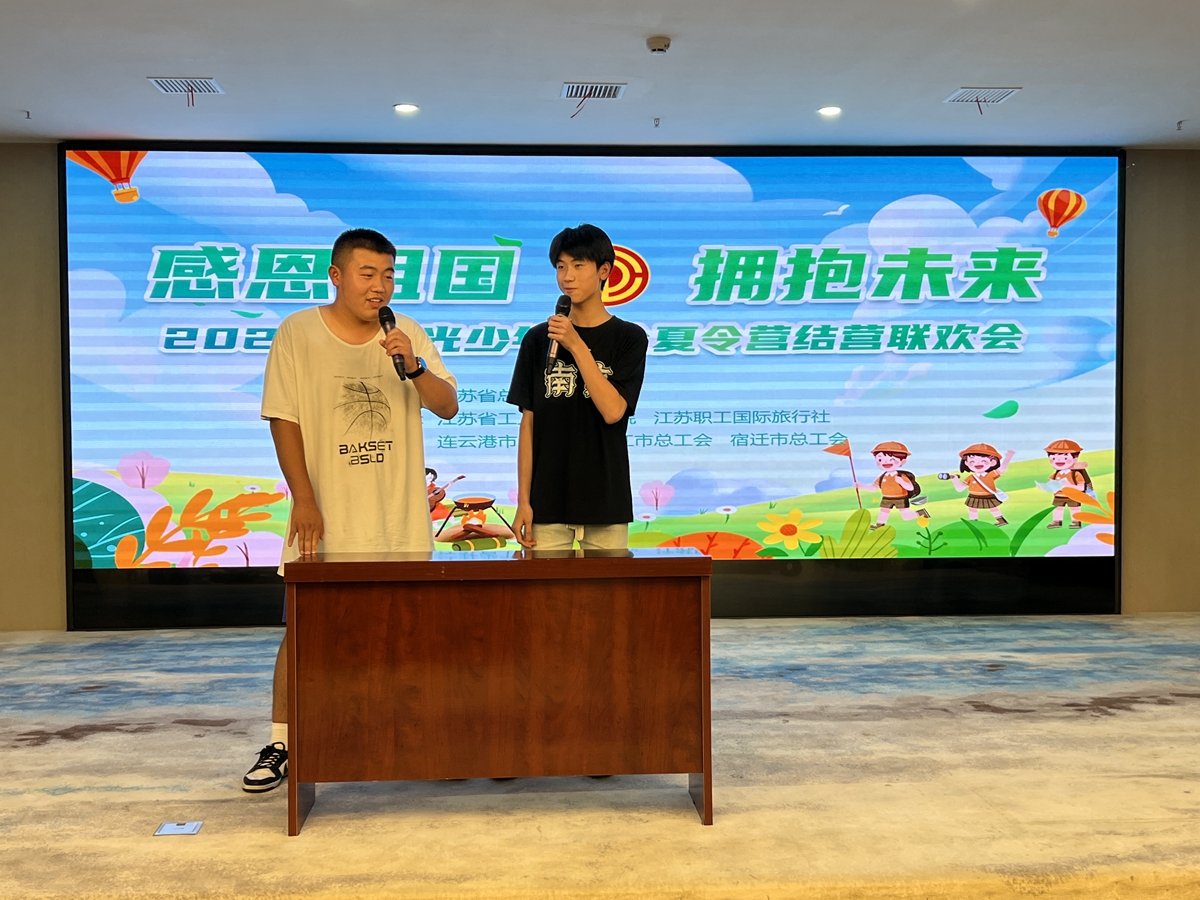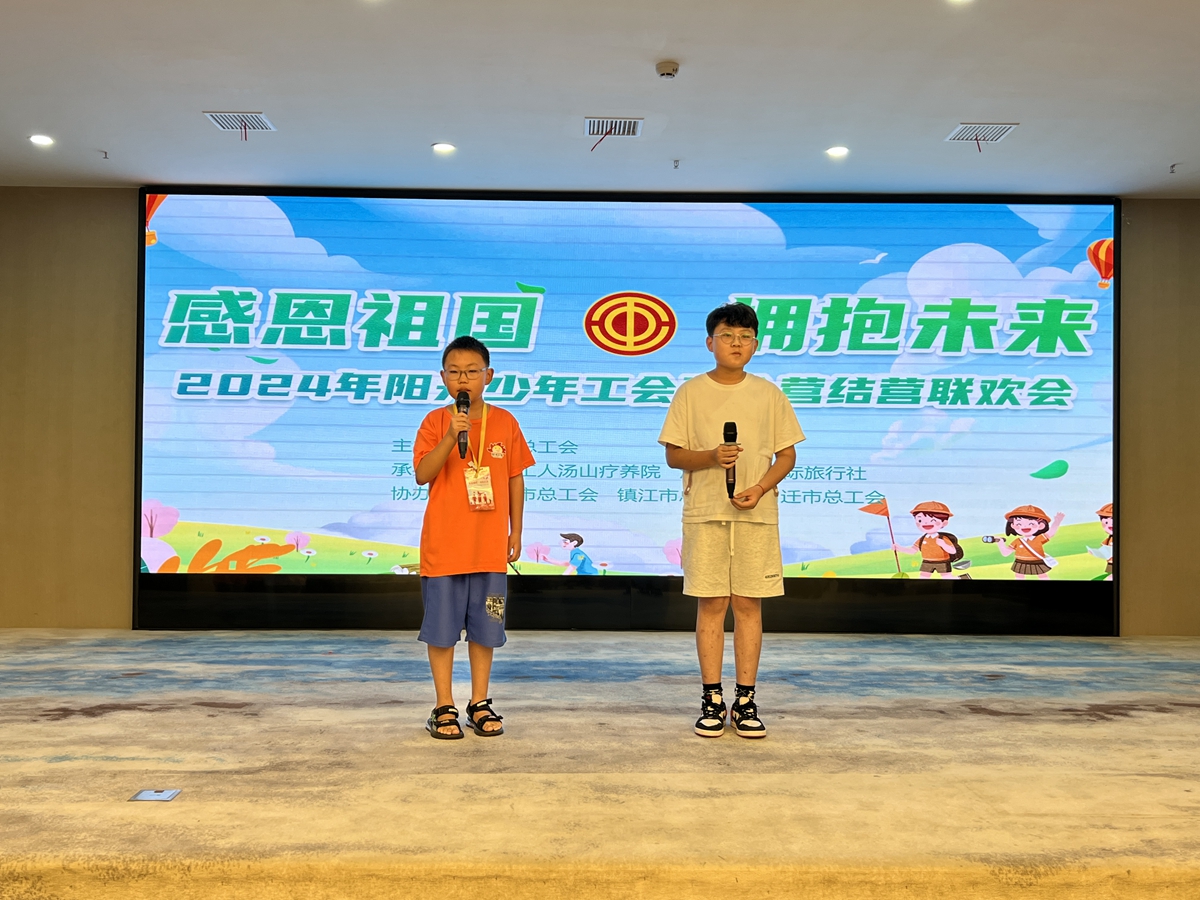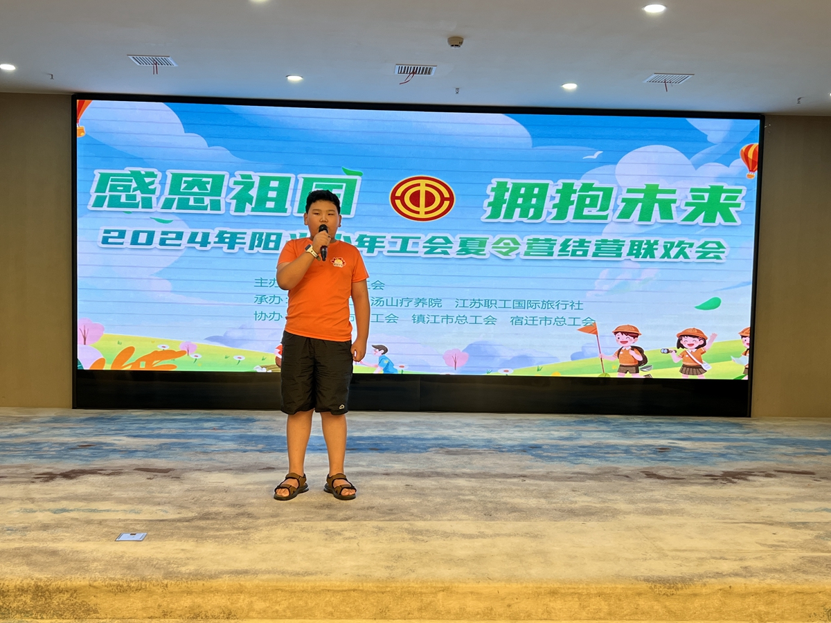 8月1日晚上,孩子们还与宿迁、镇江等地的70余名少年开展了一场热闹非凡的联欢,每一位孩子都登台展示,或歌曲串烧,或诗朗诵、或魔术表演、或自导自演小品相声,无不展现东方宝贝的自信与魅力。