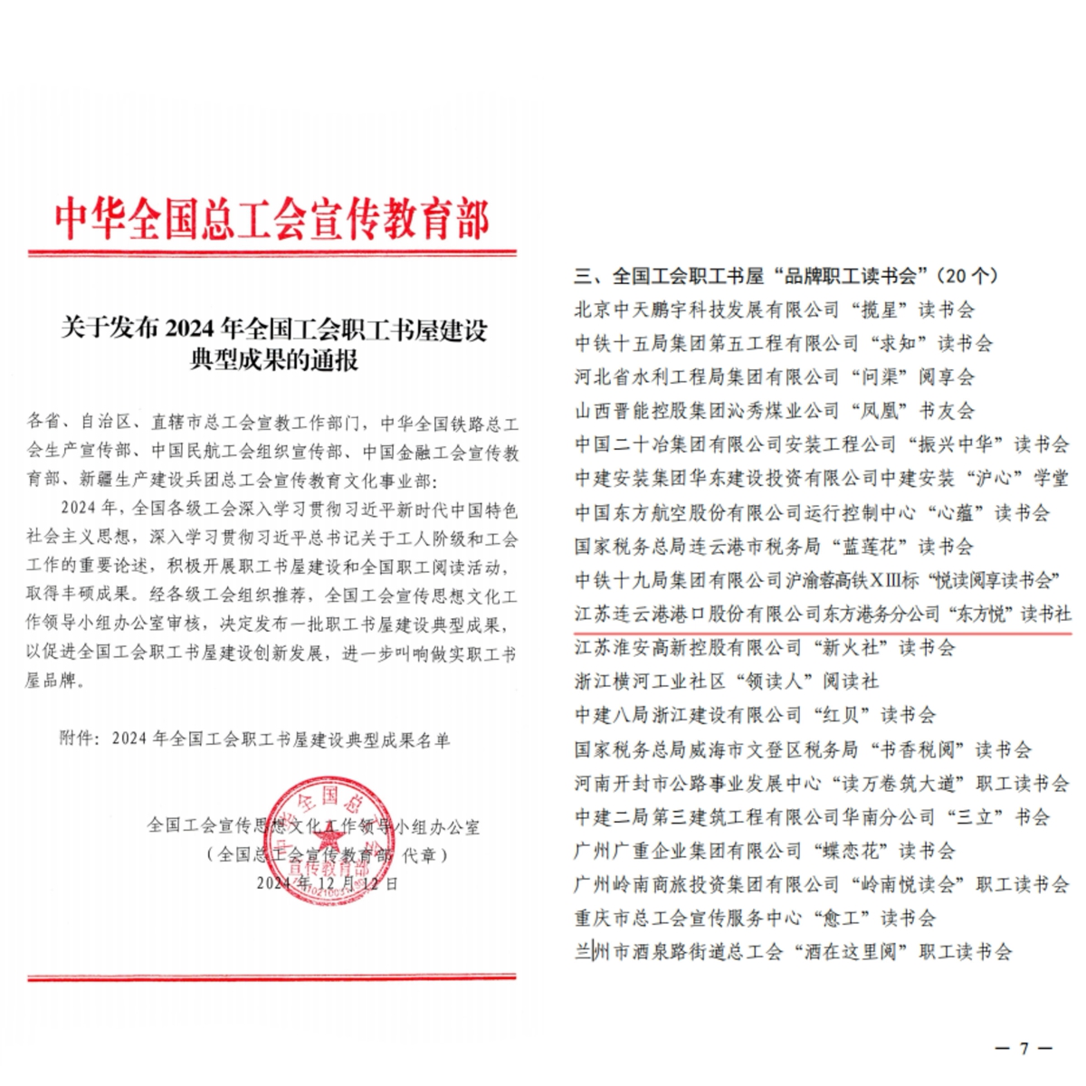 近日,全国工会宣传思想文化工作领导小组办公室发布了关于2024年全国工会职工书屋建设典型成果的通报,港口控股集团东方公司“东方悦”读书社荣获全国工会职工书屋“品牌职工读书会”荣誉称号,全国仅20家单位、全省仅3家单位获此殊荣。