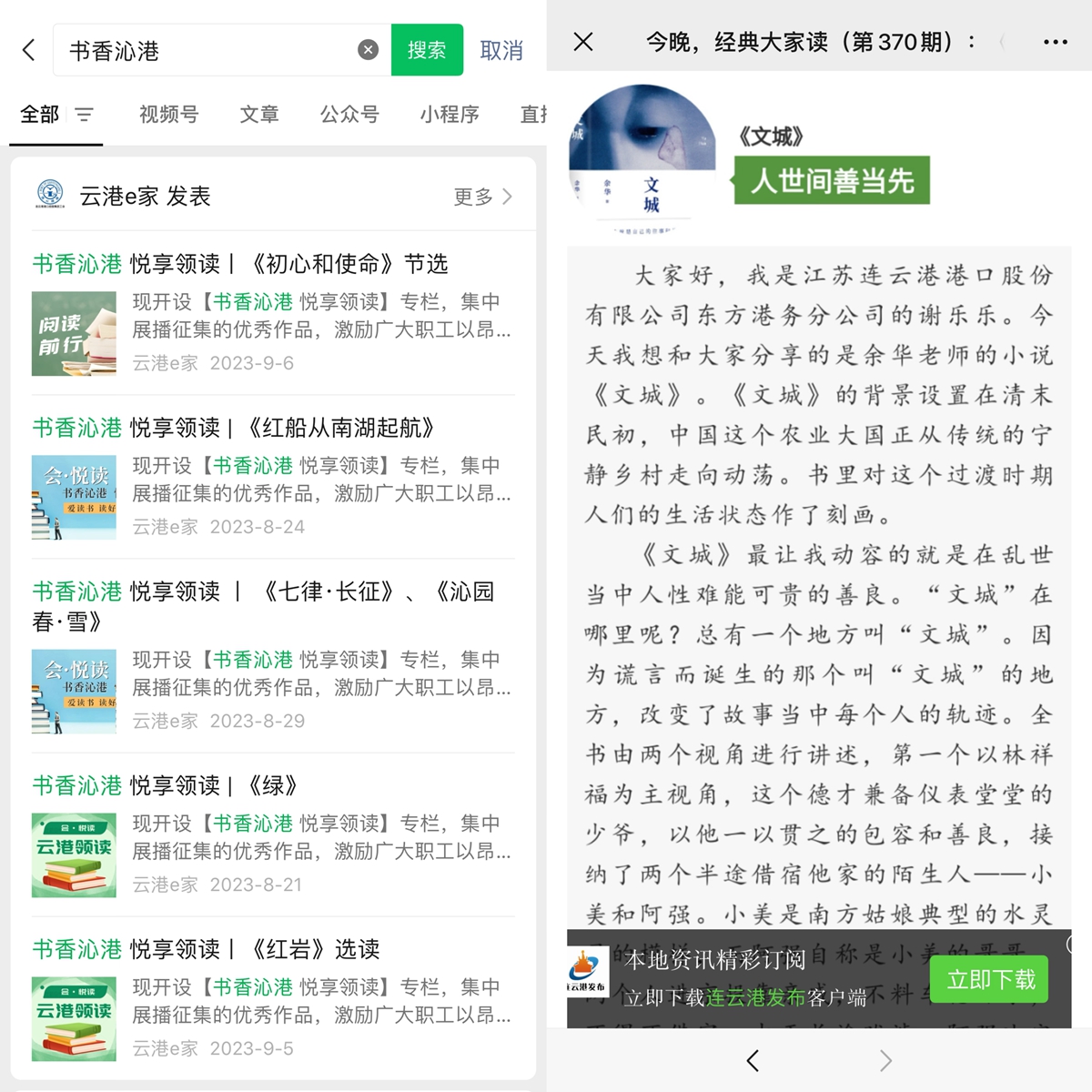 读书社用领读的方式拓展学习交流方式,通过“逐梦东方大港 争当港口工匠”主题读书活动,征集到37个音视频作品,21个作品参与集团“云港领读员”评选,优秀作品在“云港e家”微信公众号展播。1名社员参加市总工会和连云港日报社“连云港发布”栏目联合打造的“工会邀您一起悦读”活动,在领读的过程中,带领职工欣赏美文佳作,细品读书之乐。