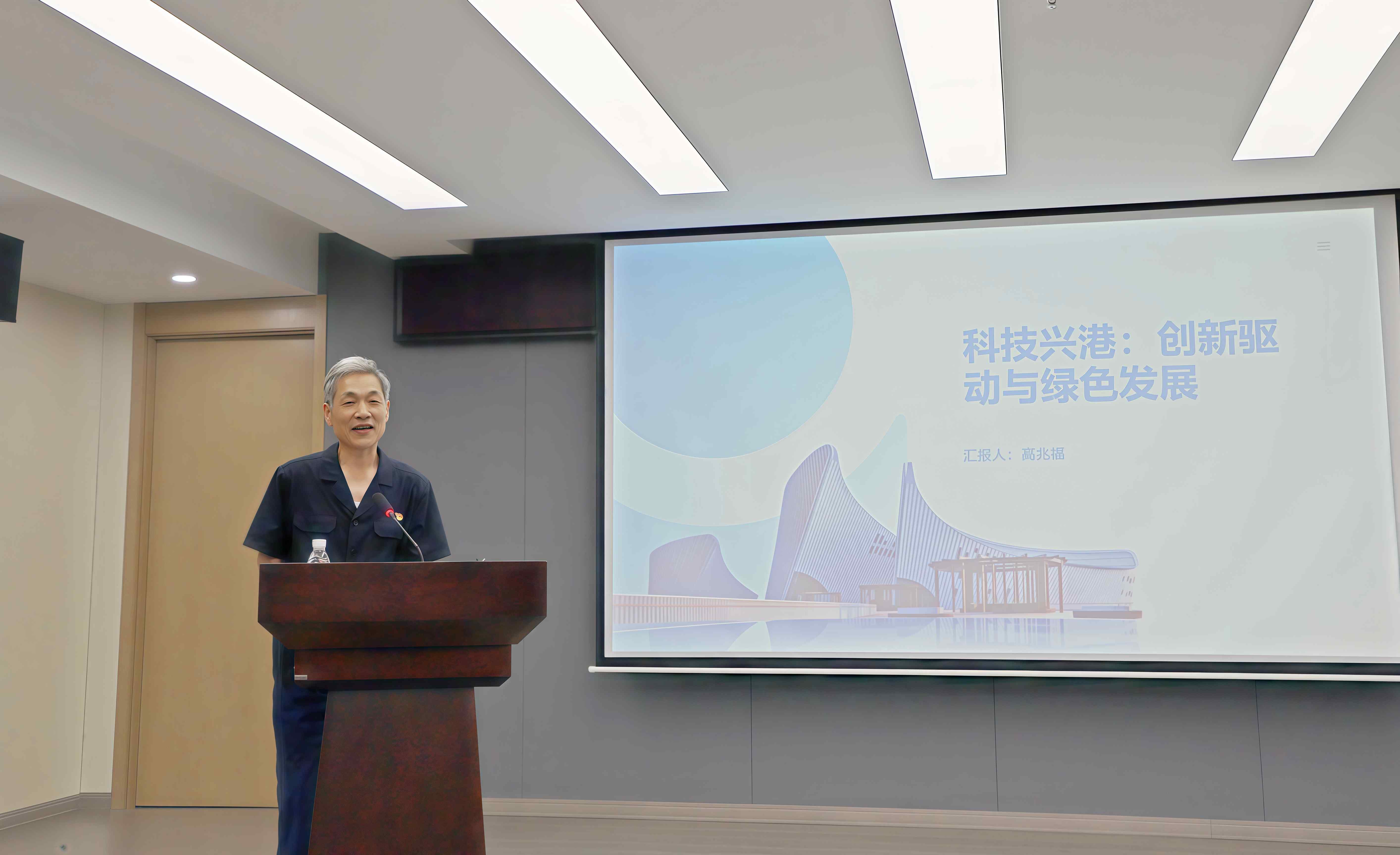全国劳模、技术研发中心高兆福以《科技兴港:创新驱动与绿色发展》为题,讲述了他在港40年的科技创新之路。面对连云港受淤泥质海岸先天条件的制约,高兆福带领团队经过几百次现场爆破试验,终于在1987年,成功攻克爆破挤淤技术。被评价为“国内首创,达到了国际先进水平”,一举摘得国家发明专利金奖及国家科技进步二等奖,并在全国港口中广泛推广,也令当时最长的拦海大堤———连云港西大堤得以成功合龙,生动诠释了他对港口事业的执着追求和赤诚热爱。