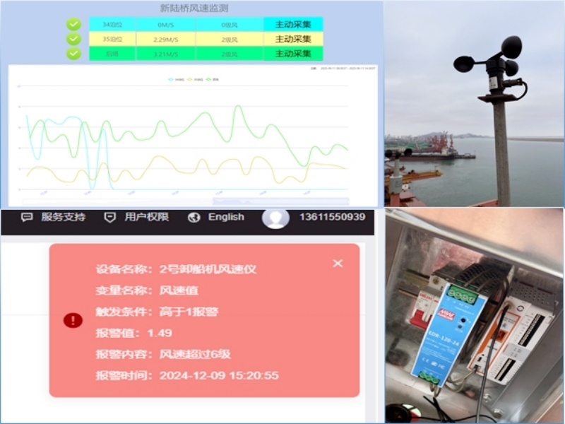 风速远程监测与记录改造:改造后,工作人员借助电脑或手机,就能实时监控 34、35 泊位及后方货场的风速数据,系统还会自动记录历史数据。而且,设定风速阈值后,一旦风速超标,手机或 APP 会即时发出报警提示,让风速监测更便捷、高效,为作业安全提供有力支持。