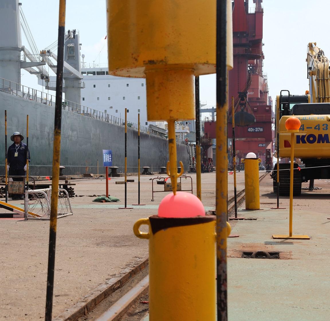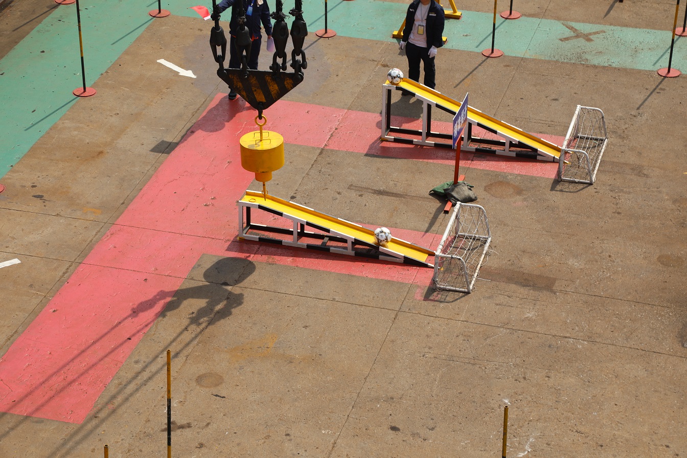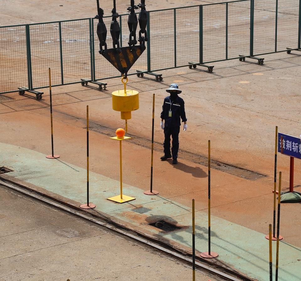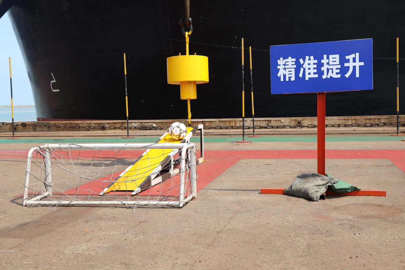 本届门机项目技术方案较上届实现全方位升级,处处彰显“以赛促技、贴合实战”的创新导向。动态目标取代静态木块:“披荆斩棘”环节,红色气球替代传统击块,内嵌彩条随风摇曳,考验司机目测精度与时机把控;复合任务挑战多维控制:新增“足球入网”项目——锚钩轻击足球,令其沿坡道精准滑入球网,需同时协调吊具位移、角度与力度;稳定性考核极致量化:“定锚把向”环节,座筒外沿放置盛水广口杯,落钩震动导致的水体洒溢量直接换算为加时惩罚,将“稳如磐石”化作可计量的硬指标。