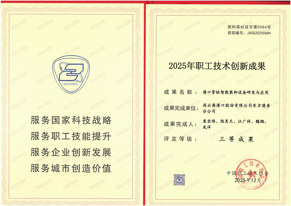 由港口控股集团东方公司袁宏伟劳模创新工作室主导研发并实施的“管桩装卸机的研发与应用”项目,荣获中国职工技术协会2025年职工技术创新成果三等奖。这一殊荣,是对项目团队扎根生产一线、以自主创新破解实际难题的高度认可,也为公司在件杂货作业的智能化、标准化进程中注入了强劲动能。