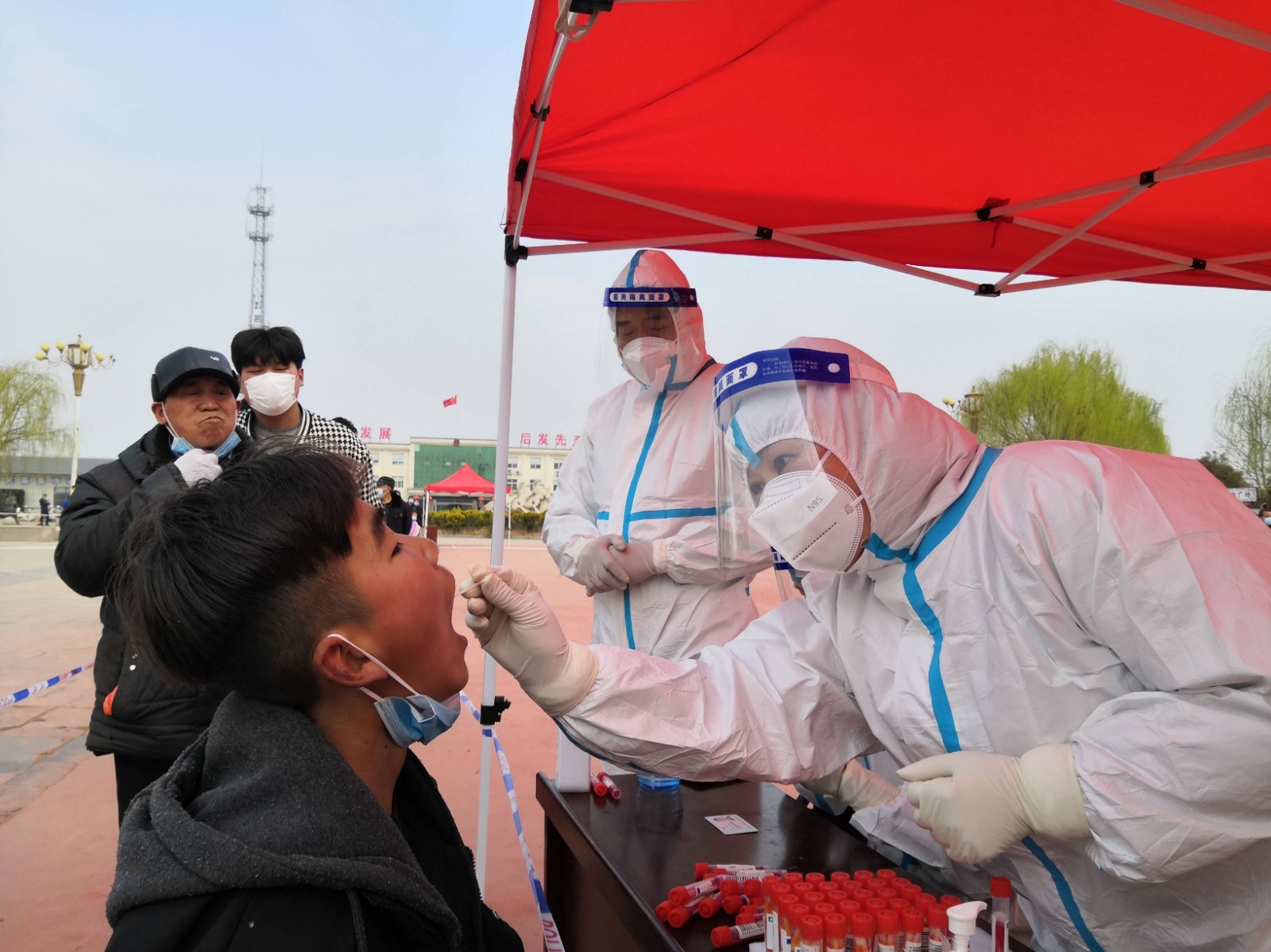 随后,秦士保将一包裹递给他,便又坐在门口,继续执勤。一个帐篷、一张桌子、一个登记本、一瓶消毒液、一个小喇叭、一台测温仪器,就是值守人员所有的防疫设施。自新一轮疫情发生以来,东海县全面落实落细各项防控措施,严防疫情蔓延。“3月9日起,我们便及时响应县委县政府的决策部署,和小区物业、社区等工作人员驻守在这里。”秦士保说,“主要是对居民进行防疫政策宣传、人员排查、秩序引导,保障好大家的健康安全。”