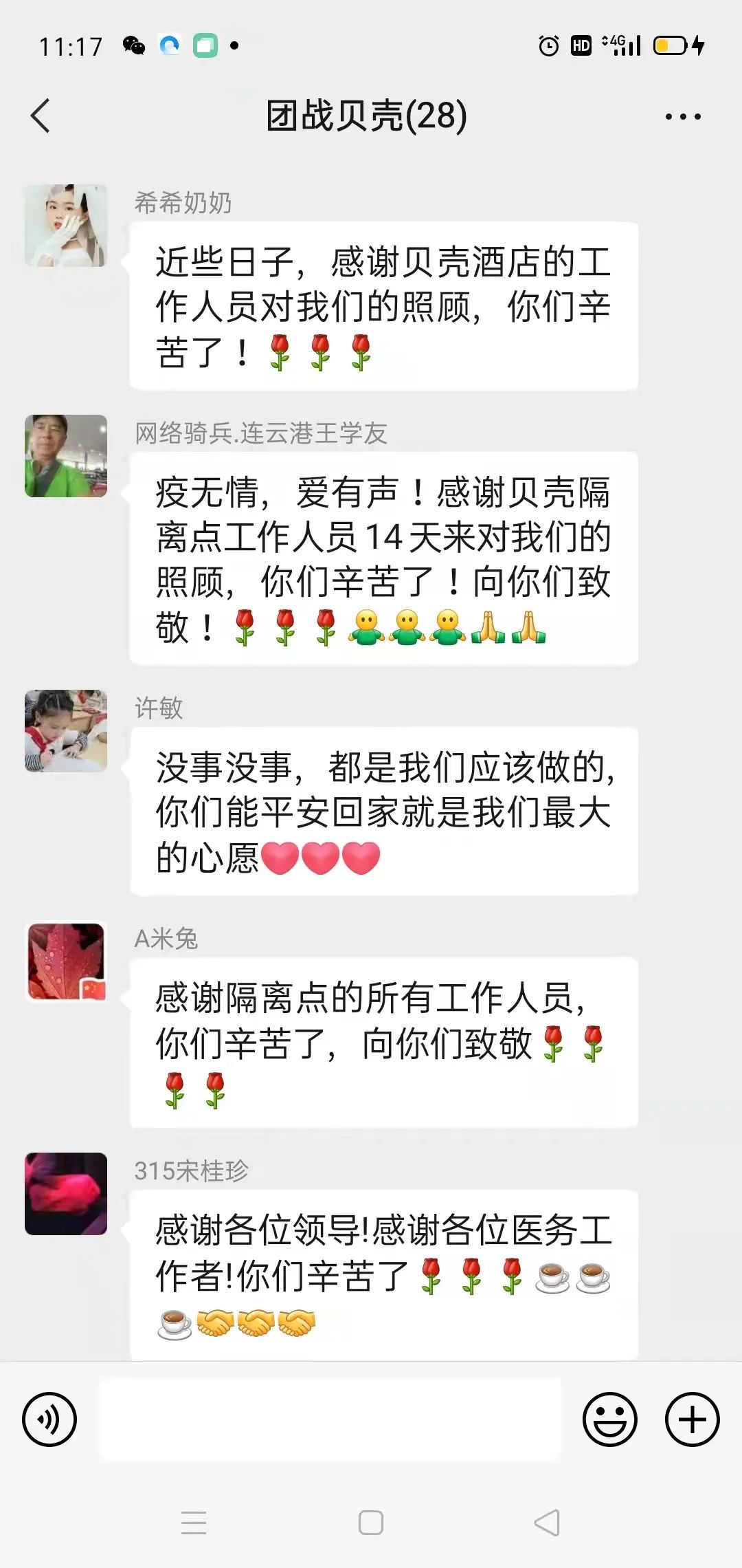 14天的隔离结束了,临别时,好多隔离人员眼里噙满了泪花不舍离去,他们纷纷在微信里留言,“谢谢你们,是你们的守护让我们看到了阳光,你们辛苦了!欢迎你们有空来海州做客,我们是永远的朋友!”