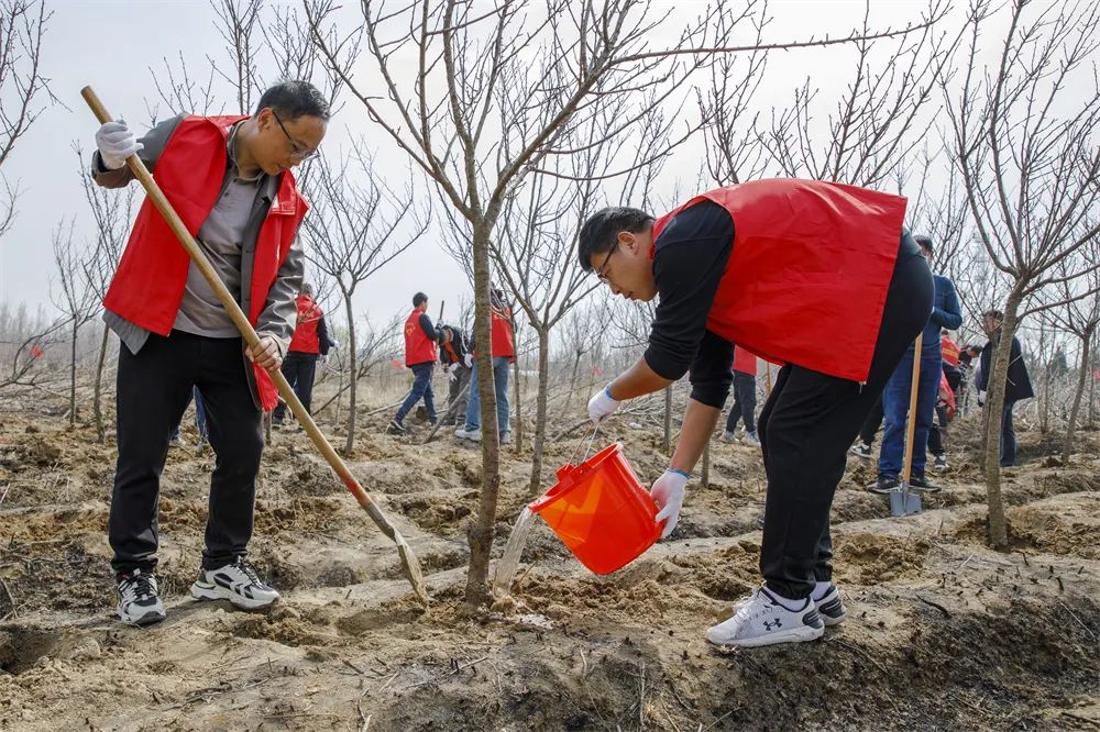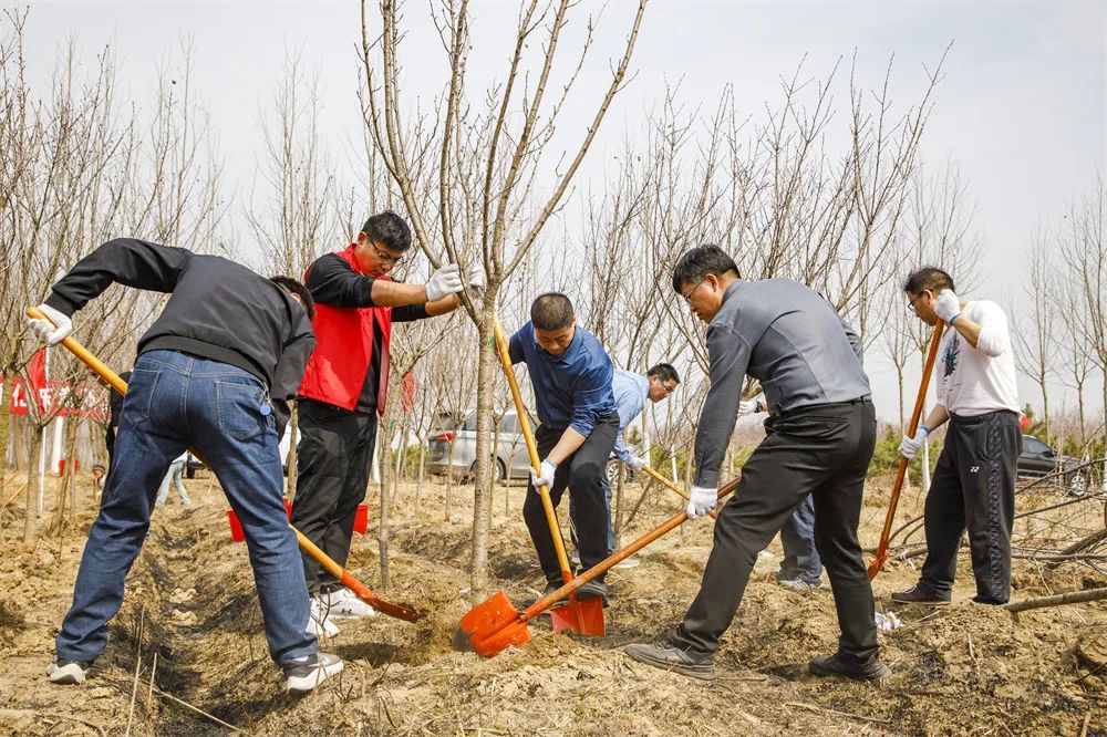 春日的林场苗圃,春暖花开,树木吐绿,一片生机盎然,正是植树造林的好时节。活动中,参加植树人员自由成组、合理分工,扶苗稳固、挥锹培土、提桶浇灌等过程配合默契,呈现出一派热闹劳动场面。经过近两个小时的辛勤劳动,新栽好的树苗迎风而立。本次植树活动共栽植樱花、乌桕等苗木1000余棵,后续将组织人员进行常态养护。